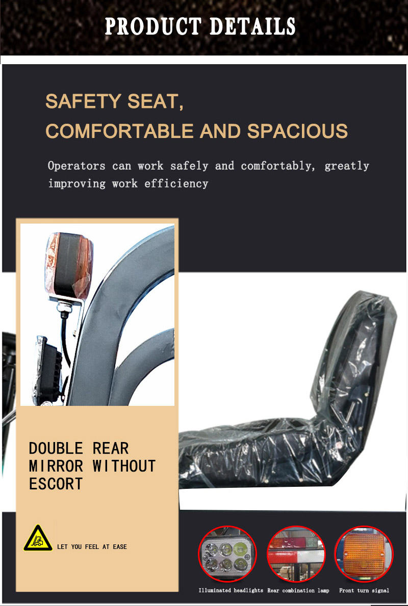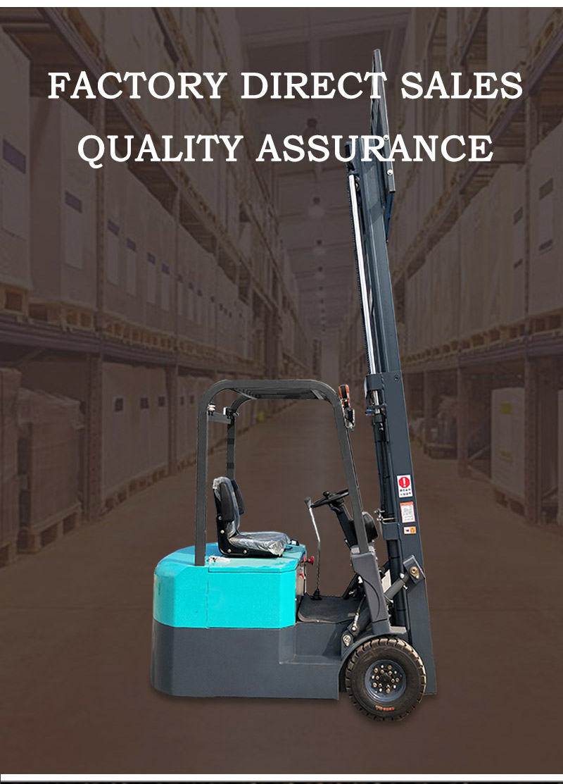 3 wheel forklift has a turtle and rabbit speed adjustment design, which is more convenient to use. The three wheel pallet lift truck is placed under the battery holder and takes up little space. 3 wheel forklift has an over-discharge prevention system that protects the life of the battery. The design of the 3 wheel pallet jack forklift's roof protects the operator's safety. The 3 wheel Pallet lift truck halogen lamp is designed to reduce power consumption.