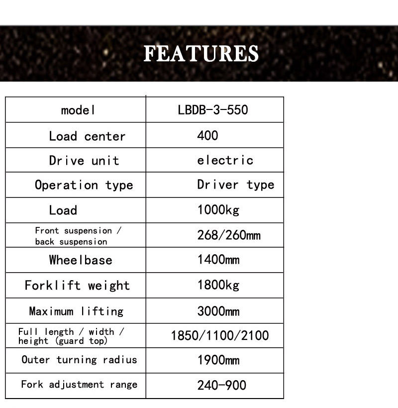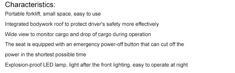 3 wheel forklift has an over-discharge prevention system that protects the life of the battery. The design of the 3wheel pallet jack forklift's roof protects the operator's safety. The 3 wheel Pallet lift truck halogen lamp is designed to reduce power con- Price : -