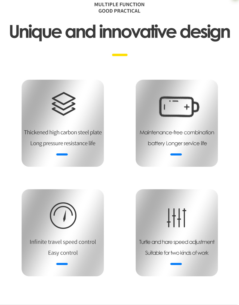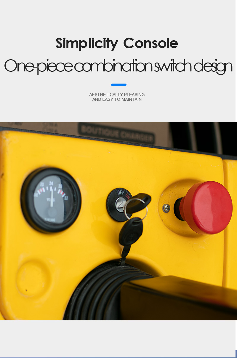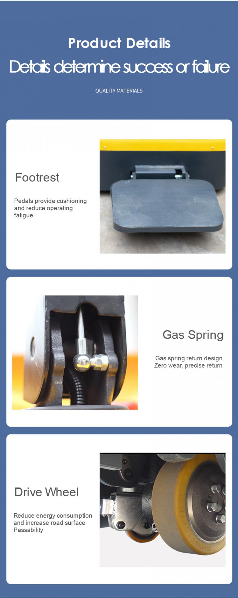 The electric driving handle of the ride on pallet jack is designed with clear functions, 99% fits the ergonomic design, the shock absorber stands the pedal, the operation is comfortable, and the fatigue is 0.Product Specification: