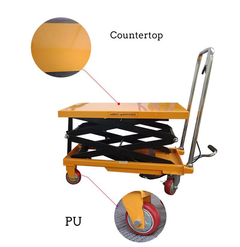 150kg Small manual adjustable height cart scissor lift,common handling tools in warehouses. The small scissor lift mechanism is light in weight and maneuverable, suitable for single operation. The small hydraulic scissor lift uses a double-protected leg structure for safer operation.