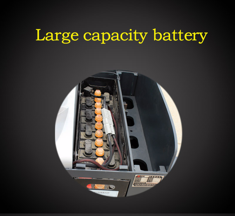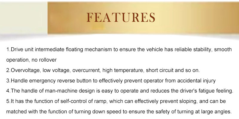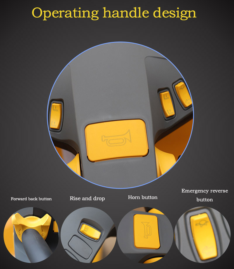 The electric driving handle of the ride on pallet jack is designed with clear functions, 99% fits the ergonomic design, the shock absorber stands the pedal, the operation is comfortable, and the fatigue is 0.