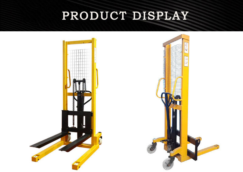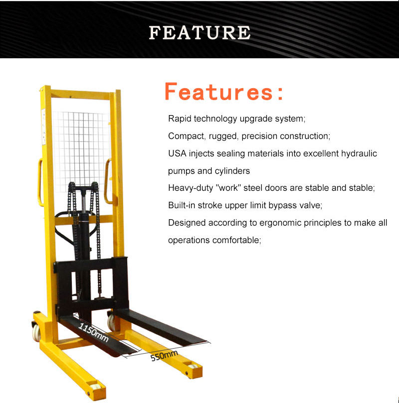 Manual hydraulic stacker uses double lifting chains for a smoother load. Manual hydraulic stacker can adjust the fork and adjust the width of the fork to meet various needs. Manual hydraulic stacker adopts high-strength pure steel guide wheel, which is wear-resistant and pressure-resistant.