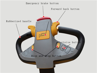 In the conventional electric walkie pallet jack, after the electric ride on pallet jack is started, the two hands act on the handle of the electric walkie pallet jack, and the force drives the steering wheel through the chain of the electric ride on pallet jack, and the pure mechanical power is transmitted to the electric walkie pallet jack, and the electric ride on pallet jack rotates. More difficult. When the electric walkie pallet jack is full of cargo, it is very difficult to walk and turn, and if the electric ride on pallet jack is driving on uneven road surface, the steering wheel vibration of the road electric walkie pallet jack will be transmitted to the handle, causing a “hands-on” phenomenon for electric handling. The handle control of the ride on pallet jack brings a certain degree of difficulty.ride on pallet jack