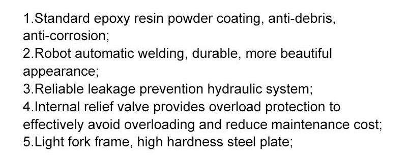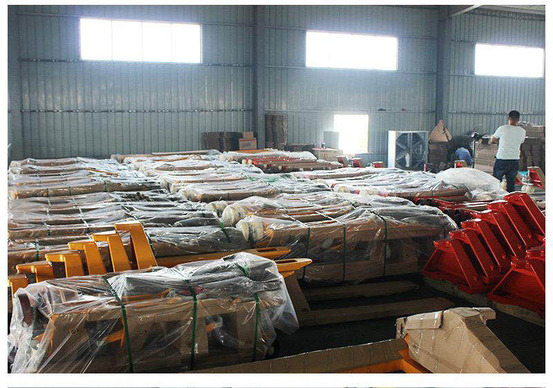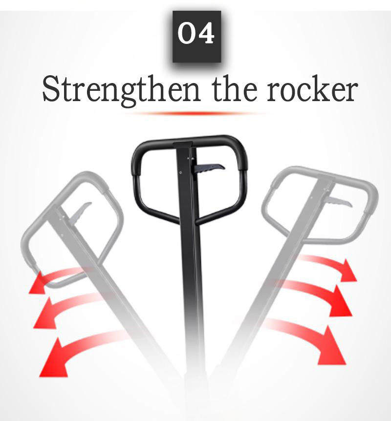 The hand pallet truck is coated with epoxy powder to prevent debris and oxidation. The hand forklift is automatically welded by the robot and is durable for up to 10 years. The small pallet jack uses a leak-proof hydraulic system that can be used for up to 10 years. The hand pallet truck's relief valve provides overload protection to effectively avoid overloading. The thickness of the steel plate of the hand forklift can be up to 45mm, and the fork is not easily deformed,the fork can be raised up to 205mm.