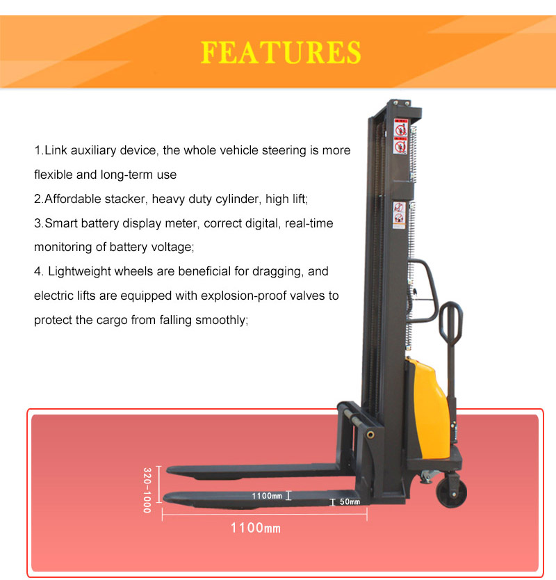 Electric stacker suppliers heavy load type C/H gantry with a maximum load of 2 tons. The warehouse stacker forklift is equipped with a high-powered motor, and the maintenance-free electric stacker suppliers provides a 120AH large-capacity battery for the buy electric stacker,it can be used for 8 hours for 4 hours. The electric stacker suppliers uses heavy-duty sealing cylinders to prevent oil leakage and low maintenance costs.